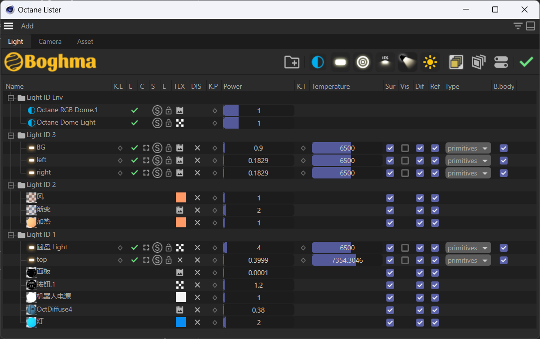 Here is my free plugin called Octane Lister which is inspired by Corona Lister. It can visualize the lights, luminescent materials, cameras, and Octane objects in the scene, and conveniently control and adjust key attributes.