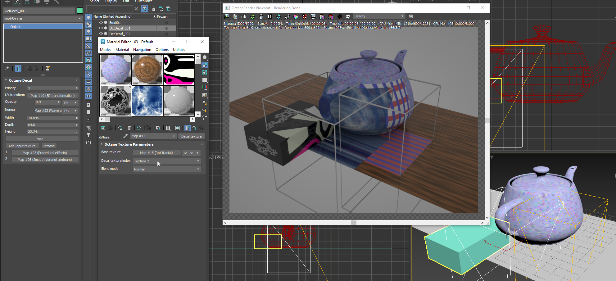 The OctDecal_002 object defines the volume where textures will be projected, and a list of textures (only 1 in this sample)