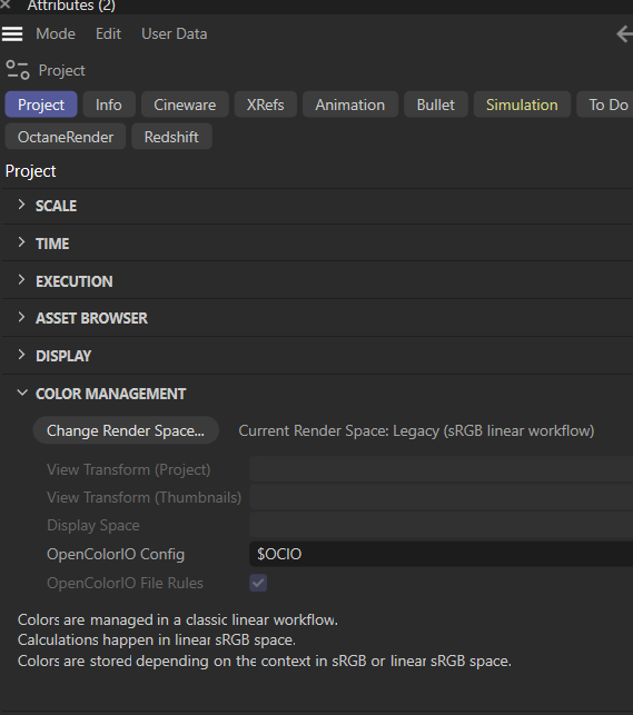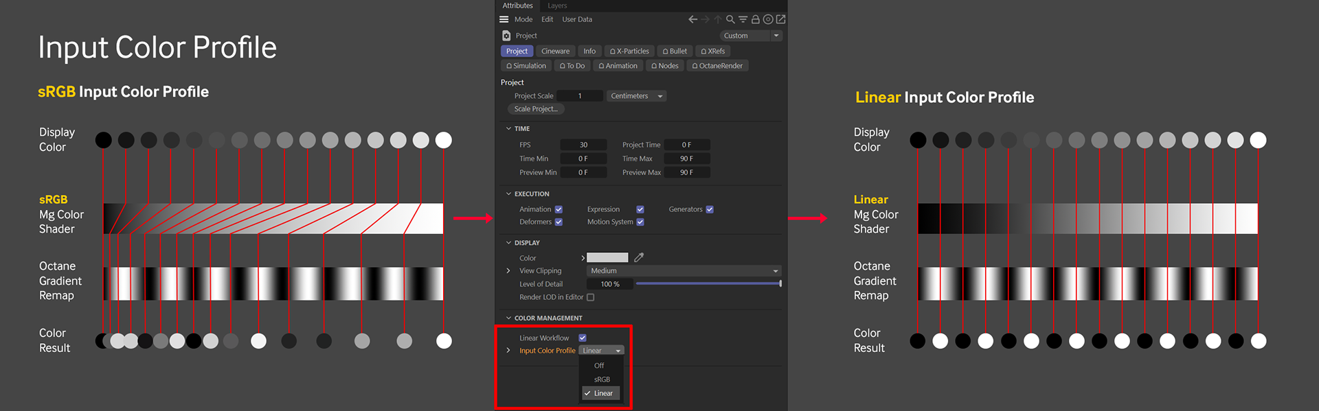 In his file it works fine, but as soon as I copy it to my files, I'm unable to make it look right. All settings should be identical, but the menu has changed in C4D and even if the settings look the same, the result still does not at all:It turns out that the Mograph Color Shader itself is influenced by the document’s Input Color Profile, which is set to sRGB by default. The sRGB Color Profile doesn’t produce a linear black to white gradient, it operates on a curve (gamma). This more closely follows how the eye perceives color (and how screens display it), but it wreaks havoc when trying to use it to map evenly distributed things like what we’re trying to do.