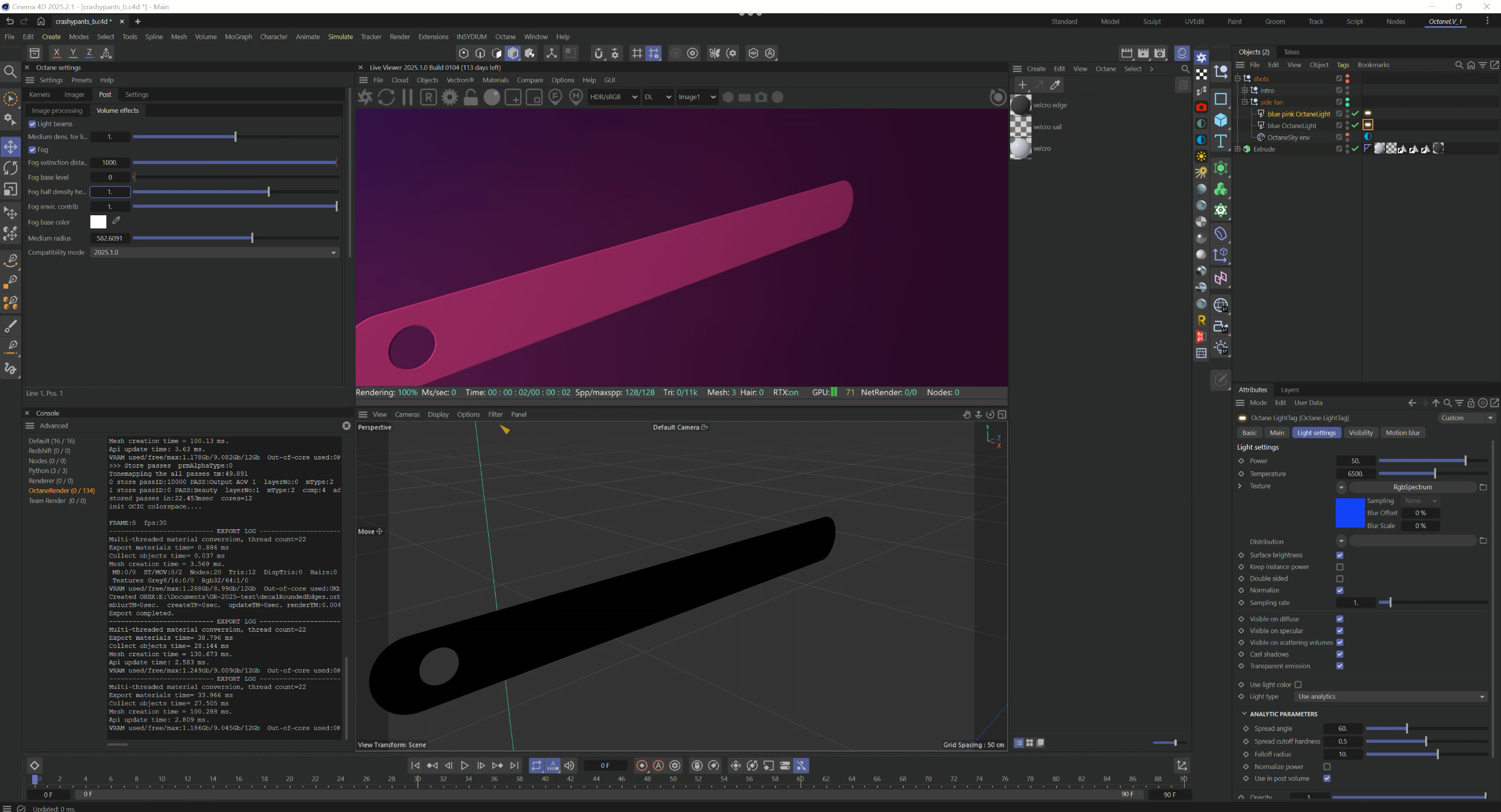 If I copy paste this scene to a new c4d file it works, but once I enable the post glows and specifically 'Light Beams' in the Volume effects tab, it crashes again.