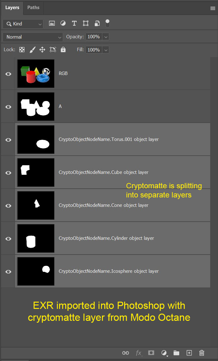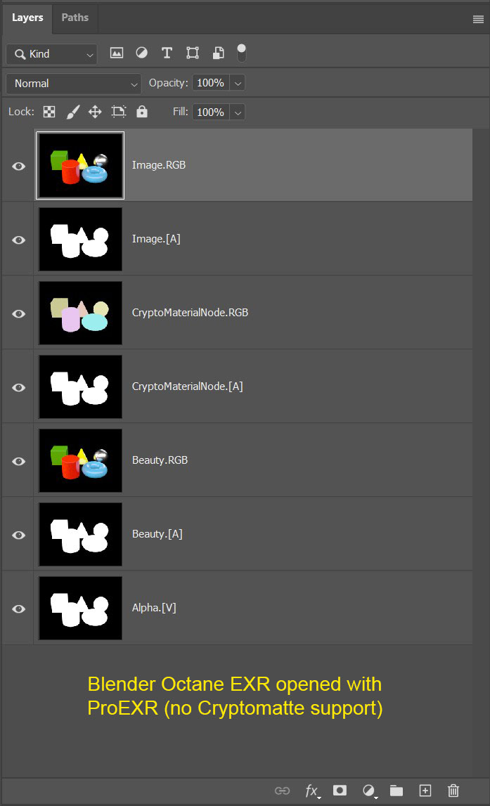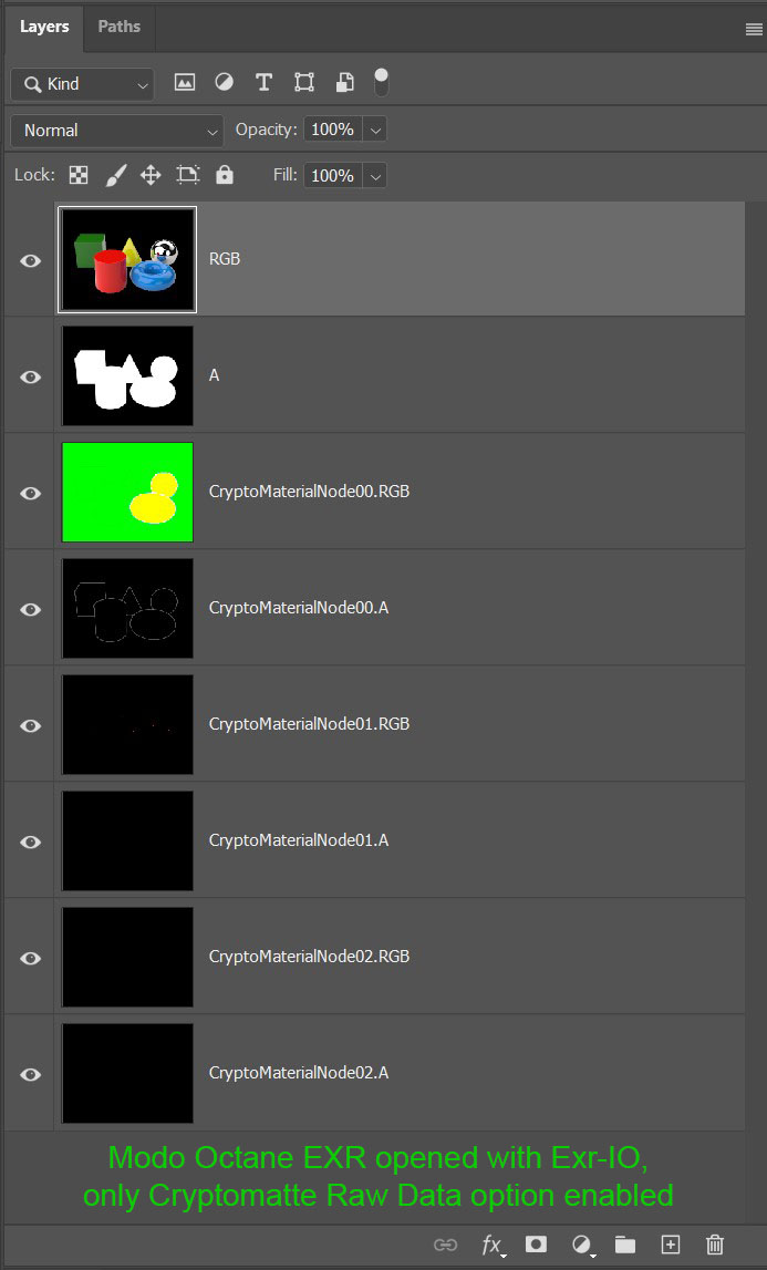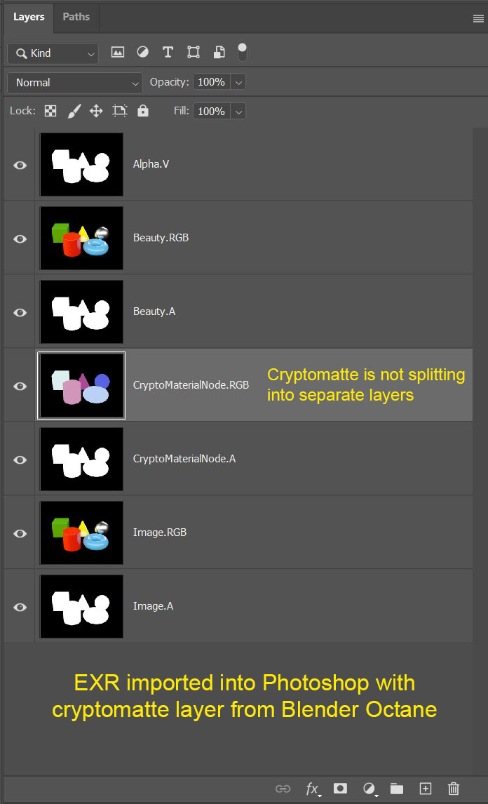 Yes, here's two screengrabs of EXR files opened in Photoshop using the Exr-IO plugin. The first is rendered with Modo Octane and is correctly splitting the Cryptomatte layer into separate layers for each material. The second is rendered with Blender Octane. The Cryptomatte is there as a layer but it is not splitting into separate material layers when opened.linograndiotoy wrote: Thu May 08, 2025 7:15 am Hi,