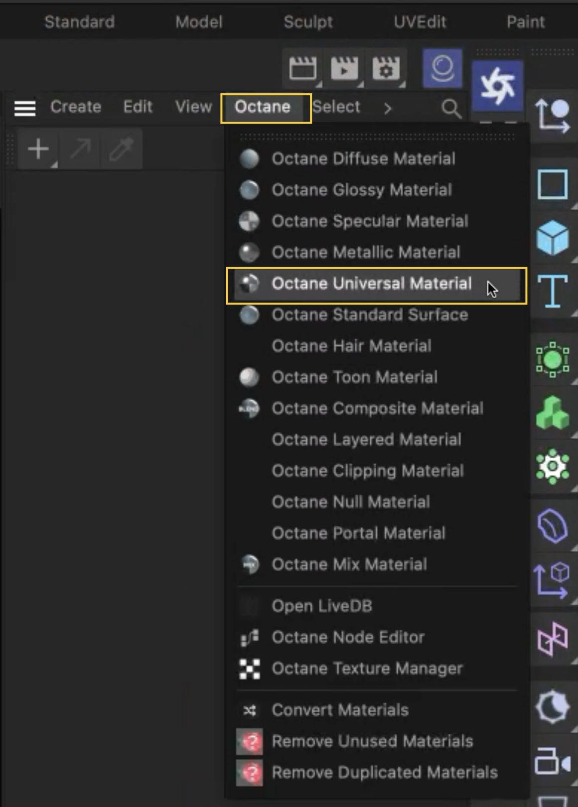 Then please go to C4D material manager and create an Octane material from Octane menu: