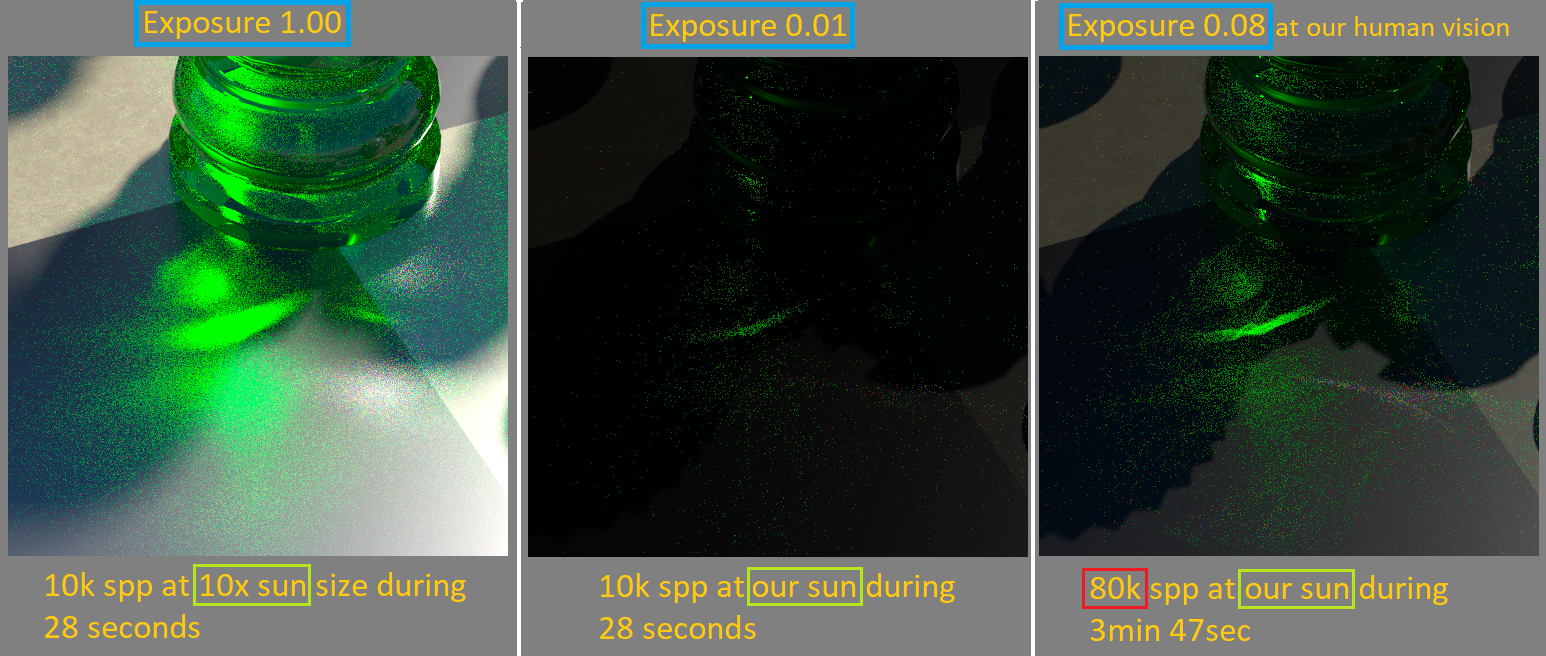 exposure-human / exposure-normal x 10k-spp) = 80k-spp-- Between 4 resolution screens at same noise+color level of caustics --