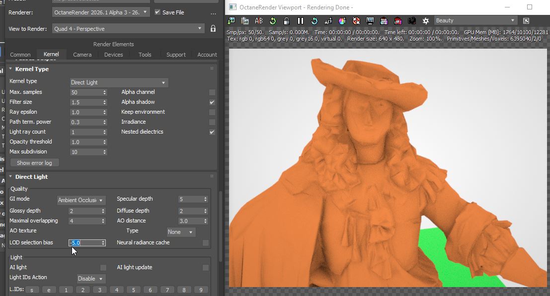 During rendering, Octane chooses a selection of "meshlets" that results in a watertight mesh while making sure that the triangles are not too small or too large in image space and compared to the pixel size. This automatically limits the amount of data that is actually loaded into VRAM without showing a visible difference to the original high resolution geometry. Since Octane needs to render the scene to determine the meshlet selection, we introduced the concept of a "settling phase" where Octane determines a fitting meshlet and virtual texture selection by iteratively rendering the current scene, and only starts progressive rendering after meshlets and virtual textures (see below) have settled.