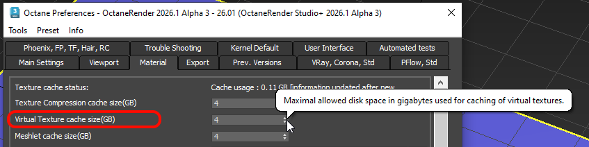 Select the size with the parameter 'Virtual Texture cache size (GB)'