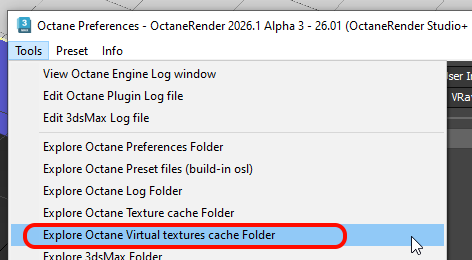 Use Octane Preferences: menu Tools/Explore Octane Virtual textures cache Folder to open Windows explorer.