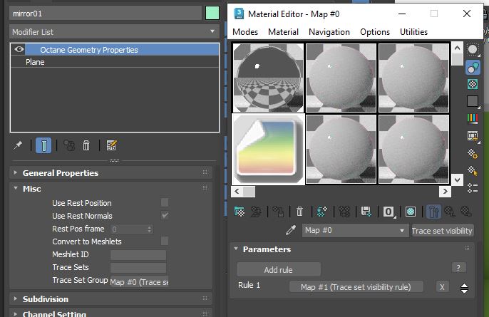 mirror01 has an Octane Geometry modifier with a Trace Set Group texture 'Map #0' (a 'Trace set visibility group' texture)