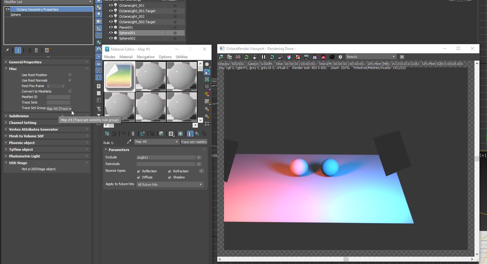 Trace sets are enabled by adding an Octane Geometry modifier to the objects.