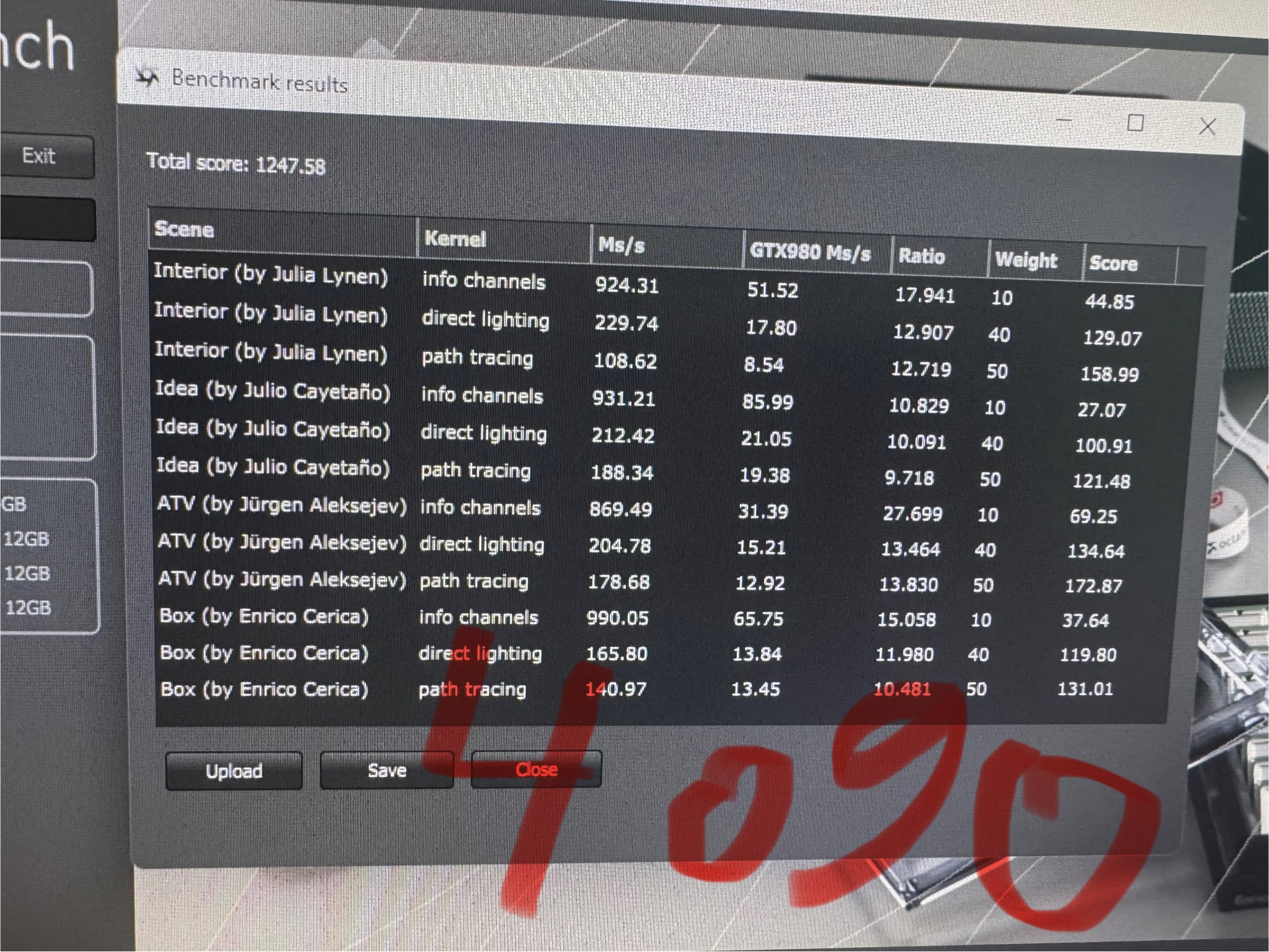 The main GPU handles peripherals and anything that relies on the graphics card, but it looks like your rig is pulling pretty heavily on the 4090. Have you tried running separate Octanebench tests on each GPU to see how they perform individually just make sure to close any running applications first (including your web browser)?