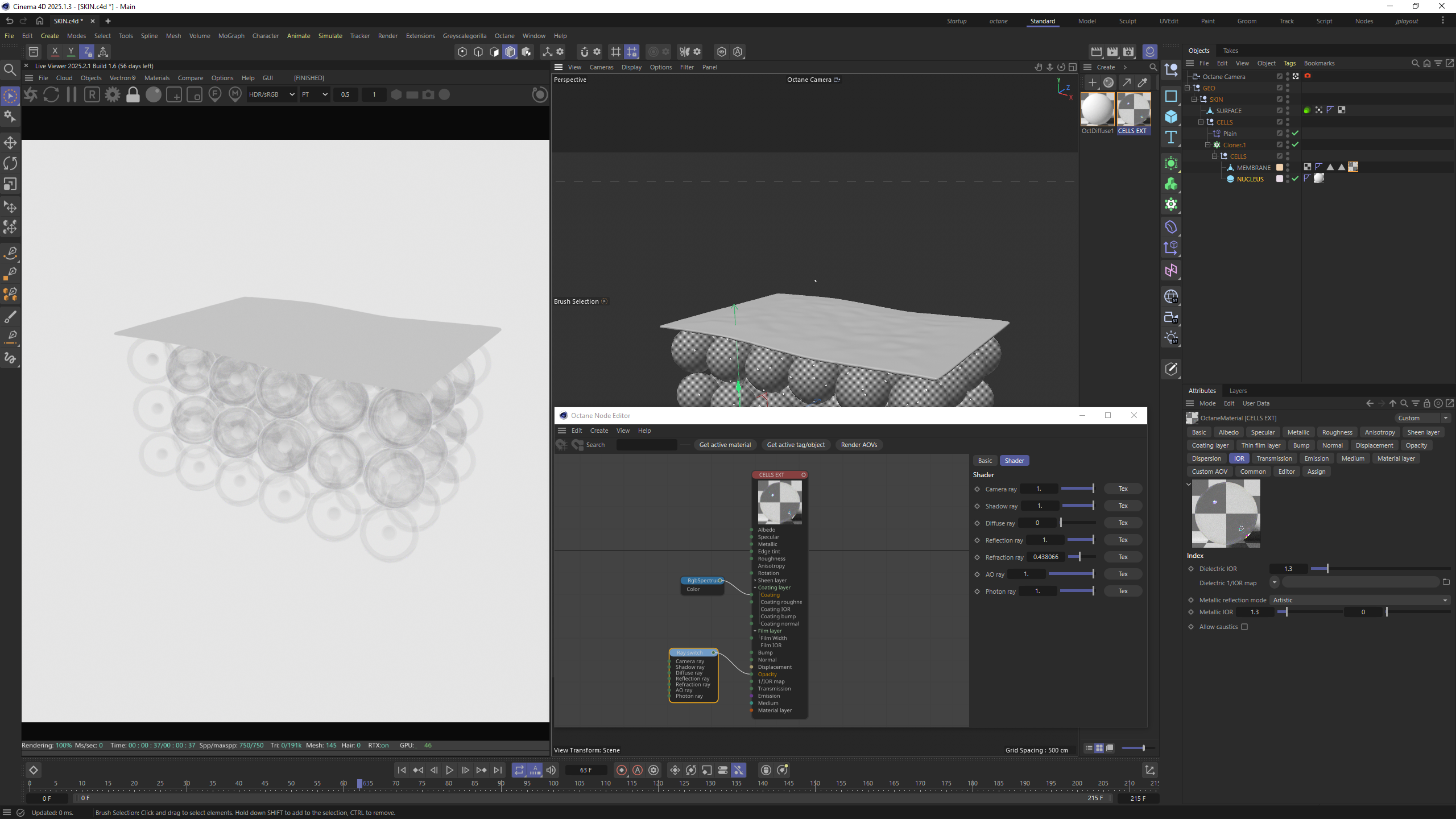 In C4D, I have rows of cells lined up behind each other in a clone. Each cell contains a nucleus.