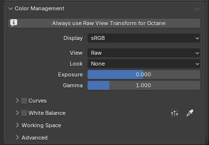 When working with Octane inside Blender, color management should generally be kept neutral in the Blender render view. In practice, that means using settings like Raw / No View Transform, as shown above.Hesekiel2517 wrote: Sat Jan 10, 2026 10:23 am5. Blender output is not the same as Octane output.
