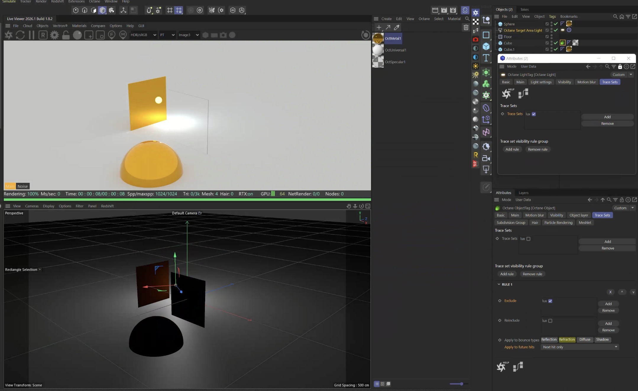 Or in 2026.1 you can now create a Trace set on the Light, then on the Glass, apply an Octane Object Tag, and exclude the Light set with only Refractive active, and "Apply to future hits" value sets to "Next hit only":