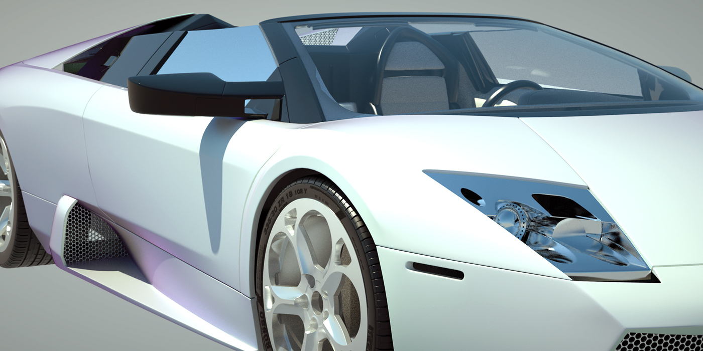 path tracing, daylight system with sun on a shallow angle, white glossy car material with .17nm thin film coating and a bump map on the tires. (the tire letters)
