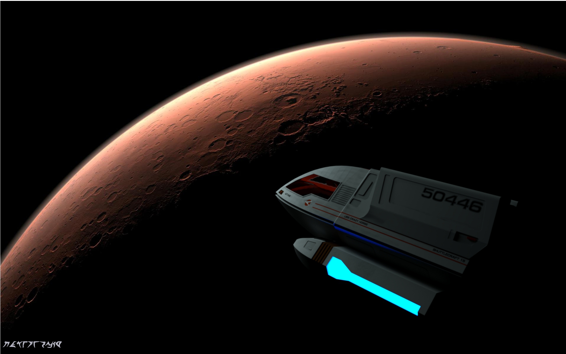 I placed a emitter plane just in front of the shuttle at an angle to match that of the light hitting the Mars backdrop behind it.