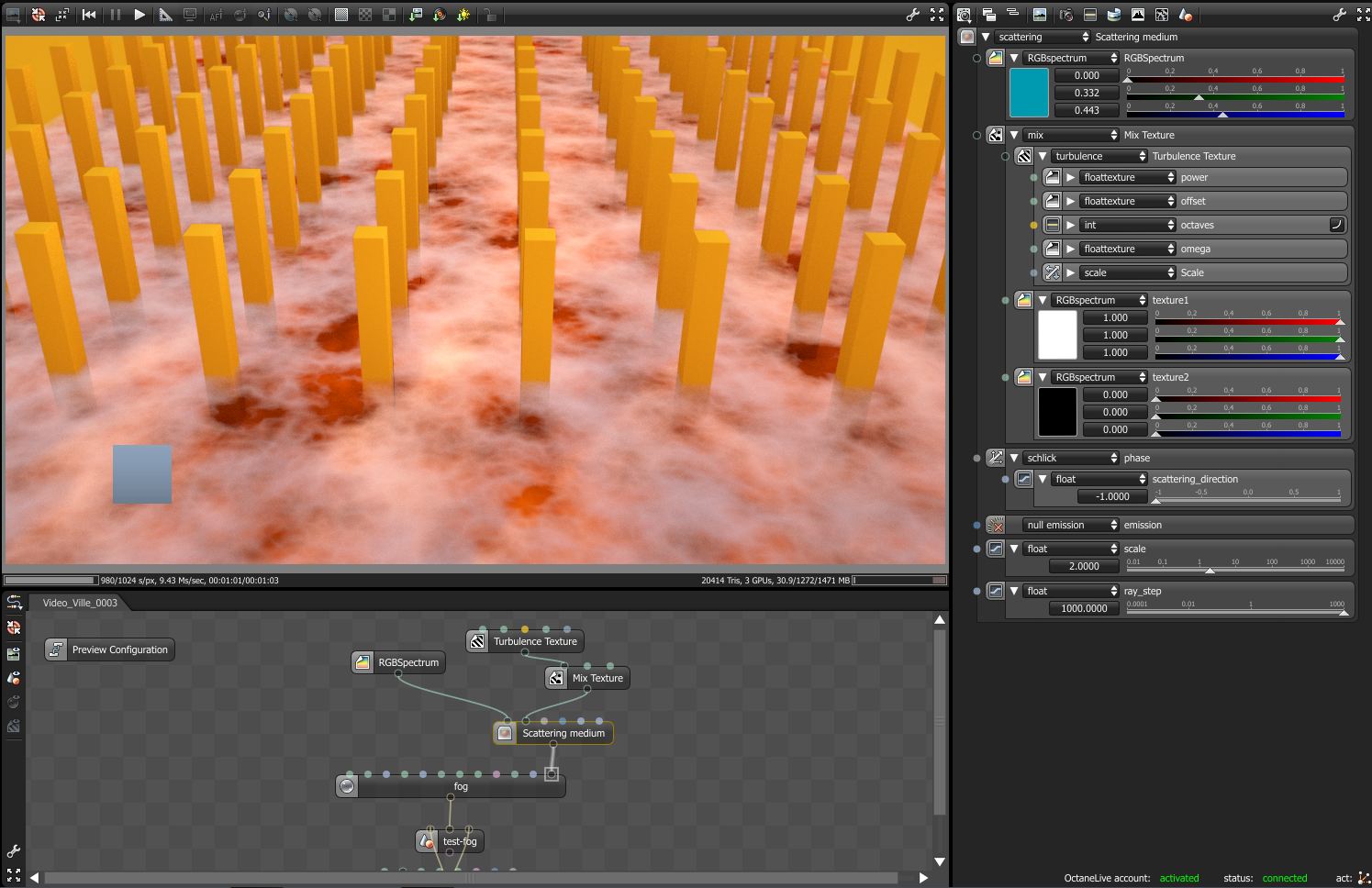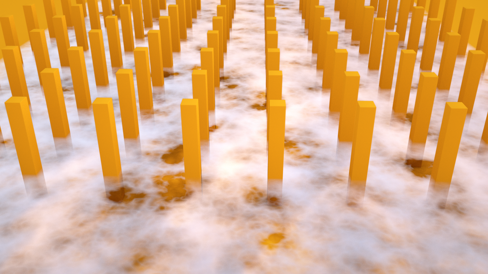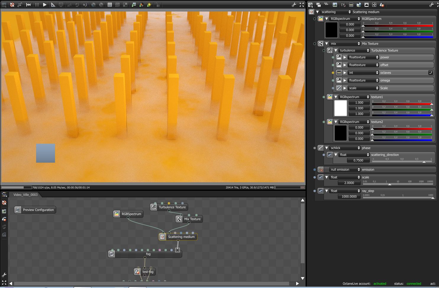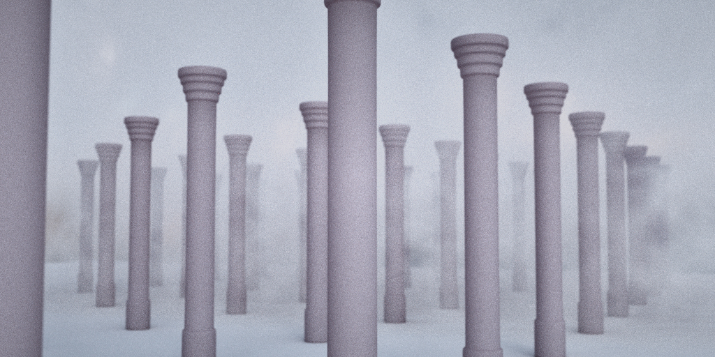 The scene is a quick model with an array of pillars, a base plane and a box to depict the volume fog. I've left some pillars out to best see the effect.
